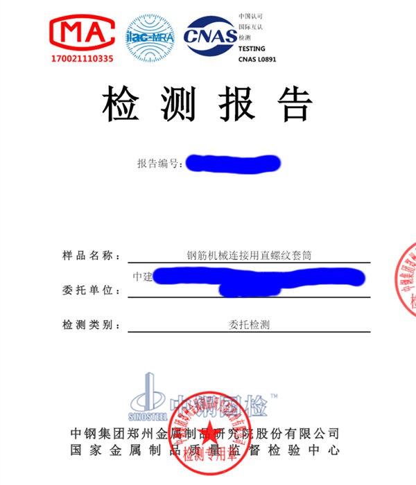检测单位:中钢国检(国家金属制品质量监督检验中心),有CMA、CNAS、桥隧、铁路、公路检测资质,全国各省市有办事处,部分城市有实验室,钢筋机械连接用直螺纹套筒检测报告及其他工程材料检测都可咨询工程师。
