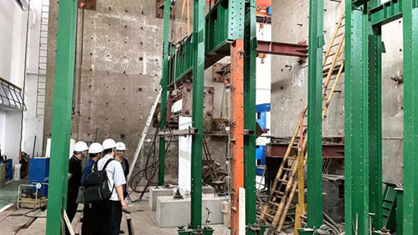 随后,土木工程学院鲁亮教授带领参观了振动台实验室,该实验室能开展建筑模拟抗震、阻尼器(墙)、支座等试验。