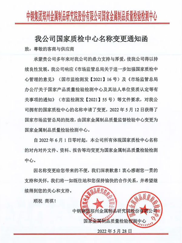 承蒙贵公司多年来对我公司的鼎力支持与厚爱,使我公司得以持续良性发展。我公司响应《市场监管总局关于进一步加强国家质检中心管理的意见》(国市监检测发【2021】16号)及《市场监管总局办公厅关于国家产品质量检验检测中心及其法人单位资质认定等有关事项的通知》(市监检测发【2021】55号)等文件要求,对我公司拥有的国家质检中心的名称申请了变更,2022年5月12日获得了国家市场监管总局的批准,由国家金属制品质量监督检验中心变更为国家金属制品质量检验检测中心。