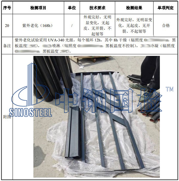 检测结论:送检样品所检项目中护栏:Mn、Cr、Ni、立柱:Al 只给实测结果不判定,其余检测项目符合技术要求。